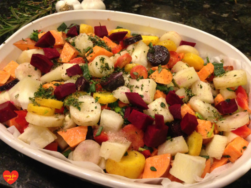 Place into preheated oven for 45 minutes. Mix vegetables halfway through to ensure even cooking.Chopped raw root vegetables in a casserole dish.