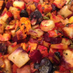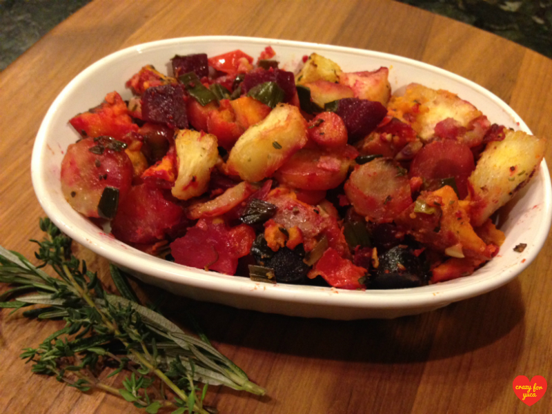 There are a wide variety of root vegetables that can be used in this recipe! I like to use sweet potatoes, carrots, parsnips, and beets. Turnips, celeriac, white potatoes, and rutabaga can also be used. Chose what you like, or what you have available. I also like to add leeks or onions, as well as peppers and garlic for more flavor and nutritional value. Rosemary and thyme add that familiar flavor that one expects from a good Thanksgiving side dish.
