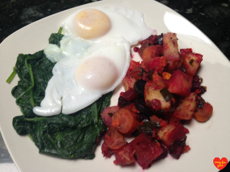 Roasted Root Vegetables With Yuca served with sunny side up eggs and spinach.
