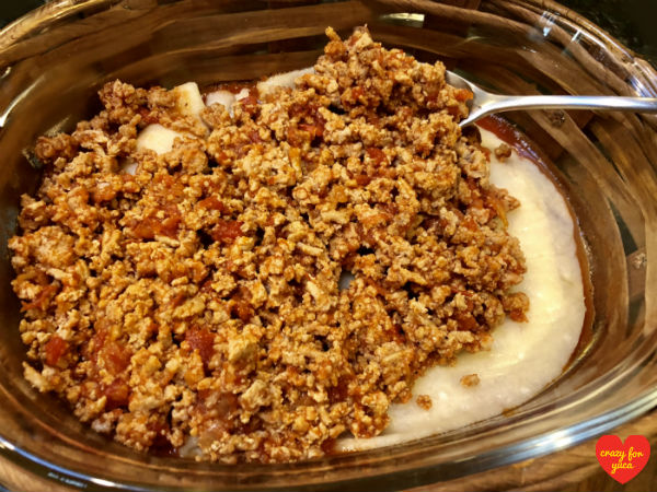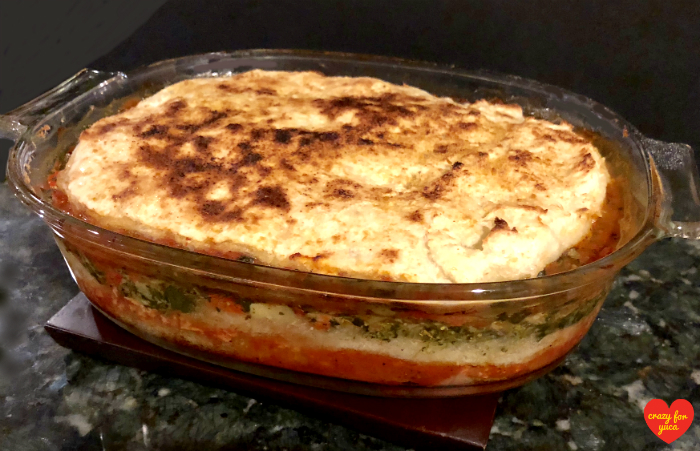 -Spoon tomato sauce to cover bottom of lasagna pan to prevent yuca layer from sticking to pan during cooking.