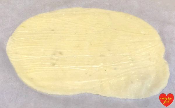 -Place each of 3 yuca dough balls on parchment paper. Using a rolling pin, roll out each yuca layer between 2 pieces of parchment. If yuca dough seems too sticky to work with, place into freezer for a few minutes before rolling out.  See: Tips for Handling Sticky Dough