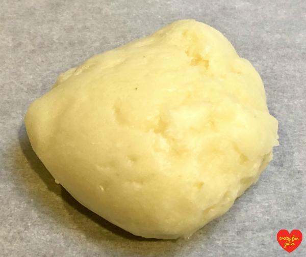 7. -Place each of 3 yuca dough balls on parchment paper. Using a rolling pin, roll out each yuca layer between 2 pieces of parchment. If yuca dough seems too sticky to work with, place into freezer for a few minutes before rolling out. See: Tips for Handling Sticky Dough