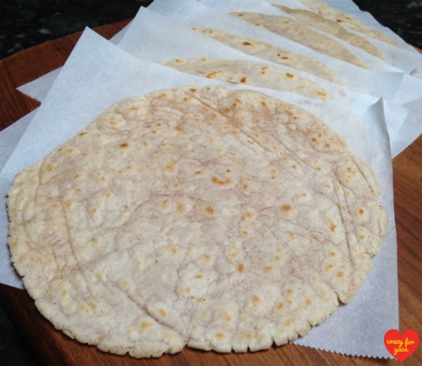 Stack each tortilla wrap on a plate, with parchment paper between each layer to prevent them from sticking together. They’re now ready to be filled with your favorite toppings. Once cooled they can also be frozen this way in a sealed plastic bag.