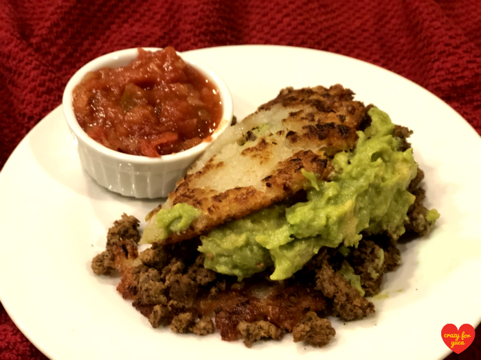 Get creative with your latkes! Wrap them around taco seasoned organic, grass-fed beef and guacamole!