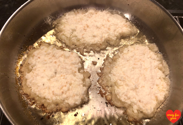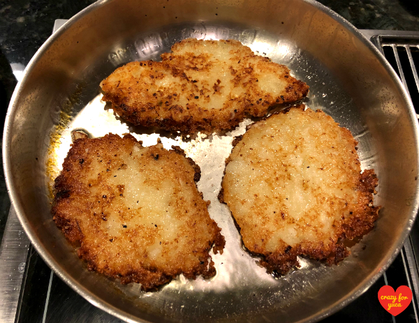 Place spoonfuls of the cassava mixture into pan to form desired sized latkes, once oil has been heated. Flatten so they aren’t too thick. The thinner they are, the crispier your latkes!