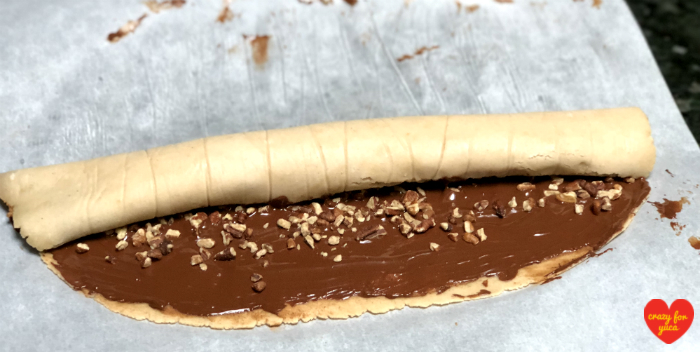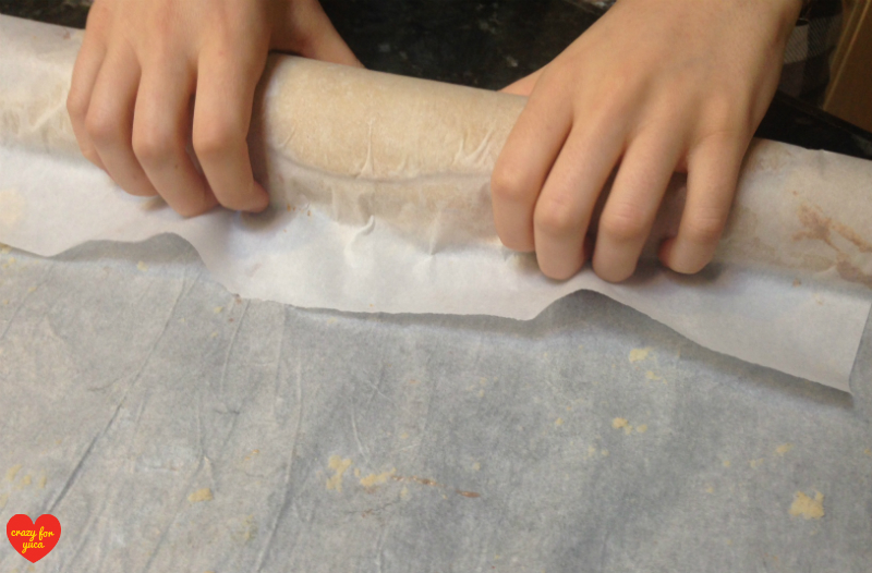 5. Starting with the end where the SunButter and chocolate were spread right up to the edge, tightly roll dough from one end to the other like a jelly roll. I find it helpful to lift parchment paper to guide the dough.