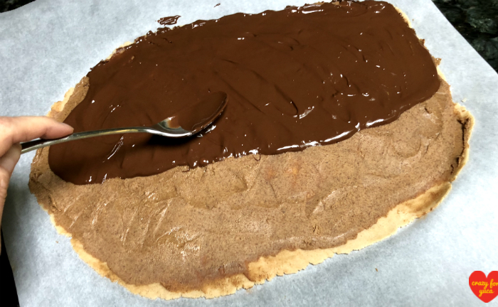 3. Place half of the melted chocolate (1/4 cup) directly on top of the Sunbutter for each of the two rolled-out pieces of dough.