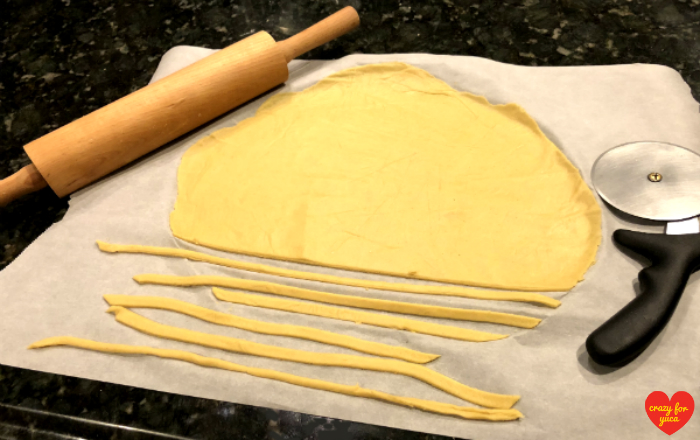 Once dough forms, place it onto a cutting board lined with parchment paper. Beware – dough can be very sticky! Parchment paper is a non-stick surface which is needed to easily work with this dough. If dough seems too sticky to work with there are a few tricks that will help.