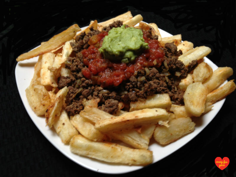 Yuca Fry Nachos make the perfect appetizer to bring out the smiles of your party guests! They also make a super fun meal – just ask my kids! These Yuca Fry Nachos are made with a combination of 3 simple recipes from Crazy For Yuca – Baked Yuca Fries, Taco Meat, and Guacamole. plus the addition of your favorite organic salsa! (I used Brad’s Organic Salsa – Mild.) YUMMY!!!