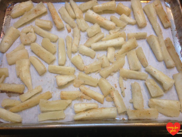 Cut each yuca piece into fry shapes. You can choose how thick or thin to make them. I usually make mine about 1/2″ – 3/4″ thick. Place cut fries into a large bowl, add avocado oil and mix until all the fries are coated in oil. (I do this with my hands so I can feel when all the fries are well-coated.)