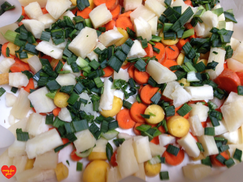 6. Chop yuca into cubes and place in roasting pan with the other vegetables.