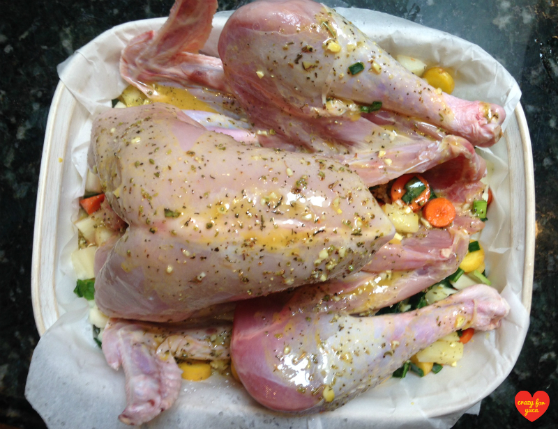 2. Wash turkey thoroughly, pat dry, and place on top of the cut-up vegetables.